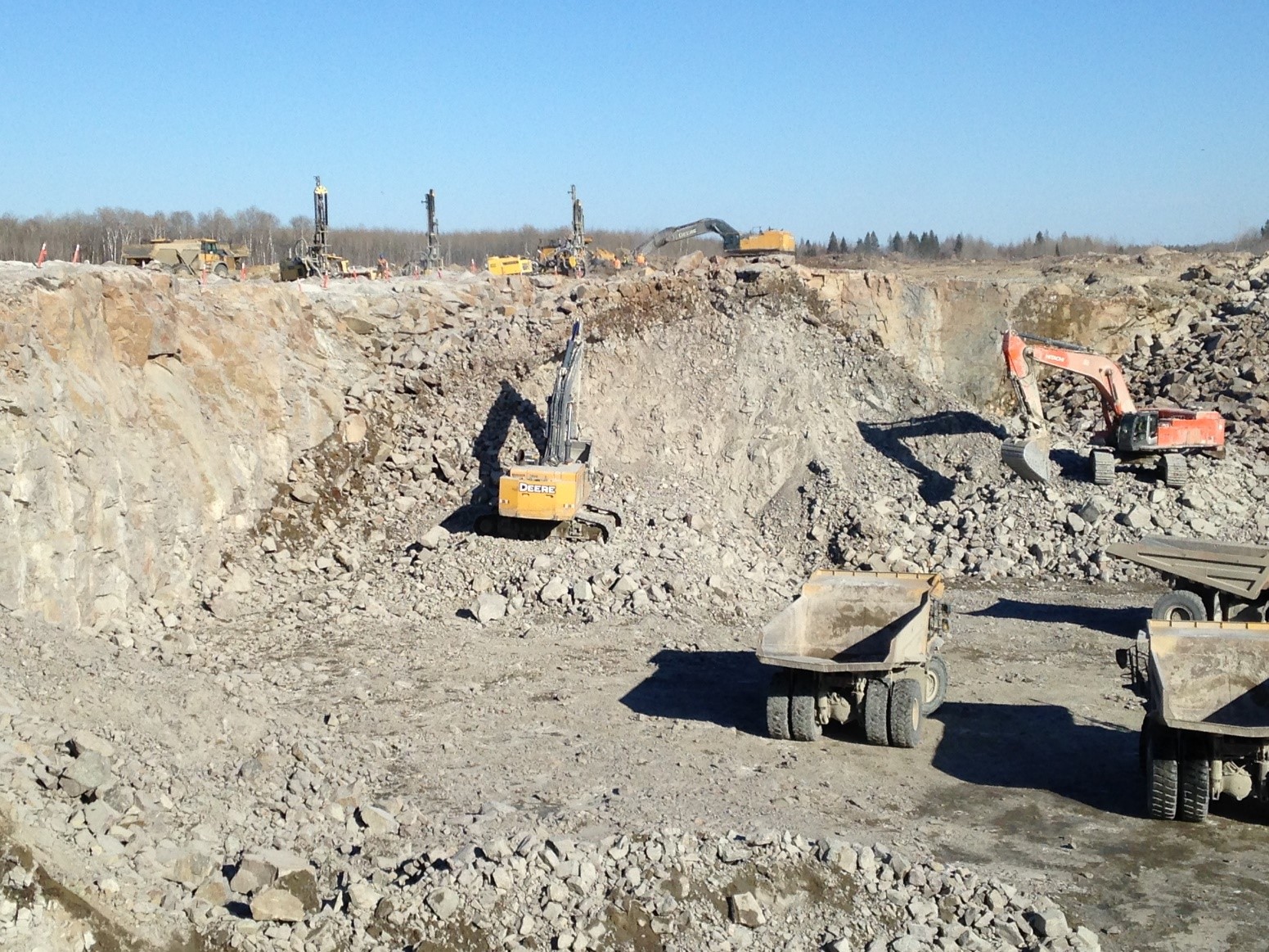 Early March 2017 DynoConsult was on site to start to organize major quarry operations of subcontractors. This included to provide guidance for excavation/stripping crew to clear necessary blast sites from overburden, construct access roads and manage water. Drill crew needed to be directed where to drill holes with respective depths; four drills were working 24/7 on this project and were asked not to stop at any time. Blast designs included large volume shots to keep mucking crew busy. Apart from these obligations, DynoConsult engineers managed explosive orders and loading crews.
