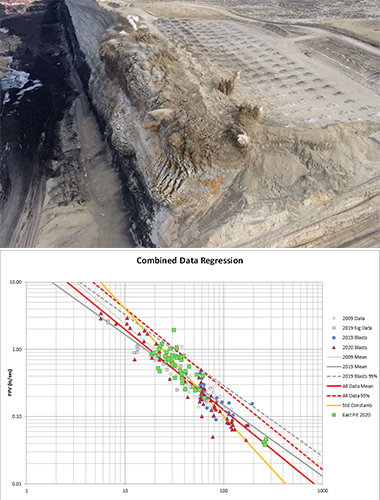 In collaboration with the mine, DynoConsult outlined a plan, performed a series of signature hole blasts, collected additional vibration data from regular mine blasts, and developed an updated characterization of the ground response. From this work, they showed the previous and current vibration data matched, and allowed definition of a new Modified Scaled Distance factor. They supported the mine in presenting the project, vibration data and results to the WY-DEQ. The result was approval of a Modified Scaled Distance factor for the mine.